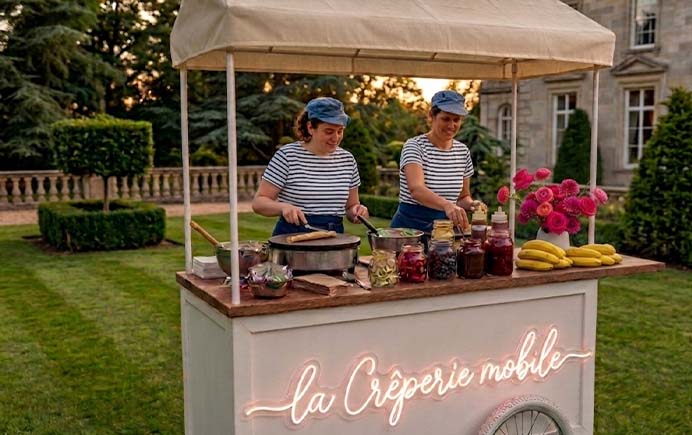 La Crêperie mobile kommt mit Koch und Küche zu Dir und bereitet vor den Augen Deiner Gäste original bretonische, salzig und süß gefüllte Crêpes zu.